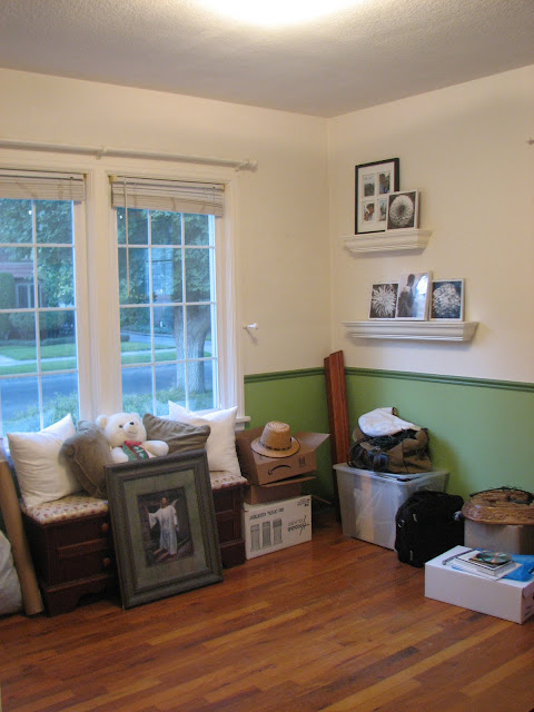 The kitchen was left in pretty bad shape when we moved in. The previous owner had attempted to remove the old wallpaper, but in the process he scratched up the plaster walls really bad. So in this room we finished removing the wallpaper, repaired the walls, painted the walls and cabinets, tore out and replaced the old linoleum flooring, added baseboards, and replaced the cabinet hardware. We purchaesd the small rolling cabinet, which I painted white, and Calvin made the shelf above it to hold the microwave. I would love to replace the blue countertops someday and change out the light above the sink.