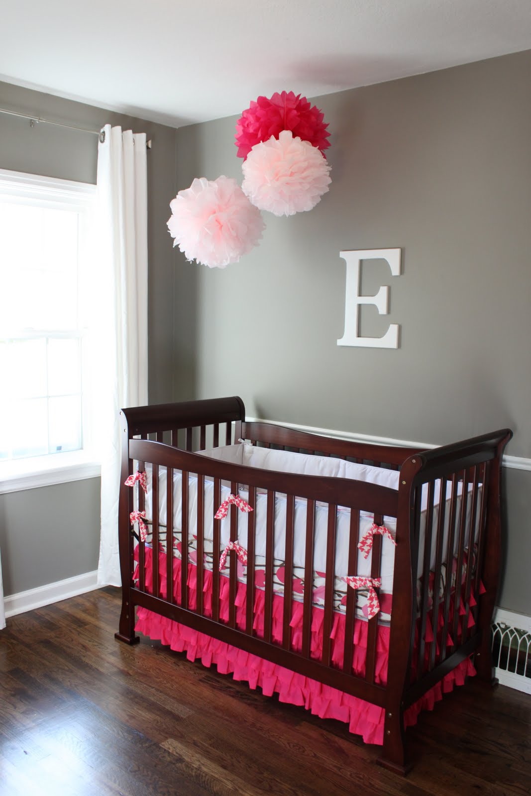 I love my daughter's nursery. It is probably my favorite room in my house. I had a lot of fun designing it too. For a few years now I have always wanted a pink and gray baby girl's room, so I think it was only a couple days after I found out I was having a girl that I painted the room gray. I am in love with the color gray. It is warm and sophisticated, and it is also the perfect backdrop for other colors. I think my style is best described as transitional. I like traditional combined with comtemporary. E's room has a traditional feel with the warm coffee colored furniture and the curved lines of her crib, but then I added splashes of bright colors for a more modern look.